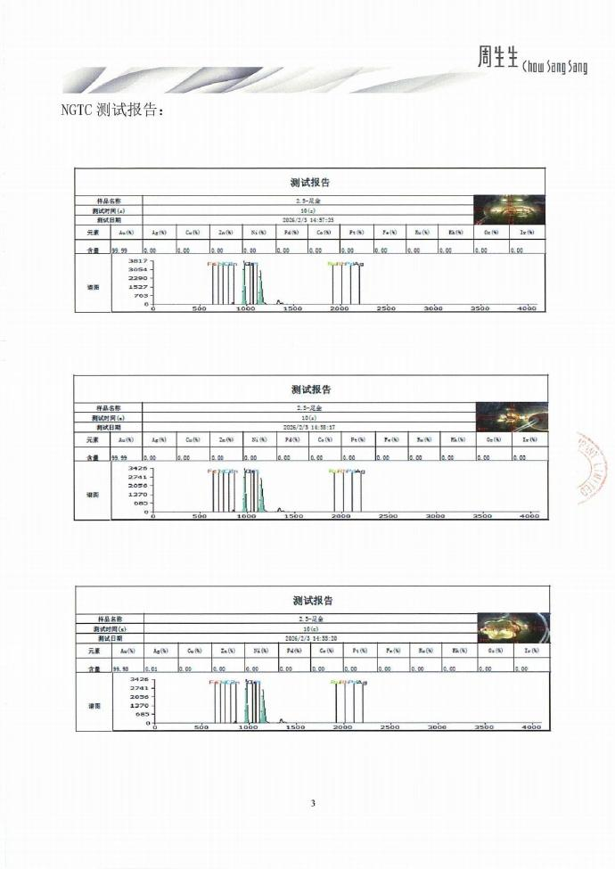 同时,周生生已将同批次同款福袋送检至国家珠宝玉石首饰检验集团有限公司(NGTC),采用X射线荧光光谱法(XRF)进行检测,该福袋货品的检测结论为足金饰品(报告编号:P-ZSSA2121621)。NGTC对该货品随机选取3个检测点,检测所得金含量结果依次为99.99%、99.99%、99.98%。