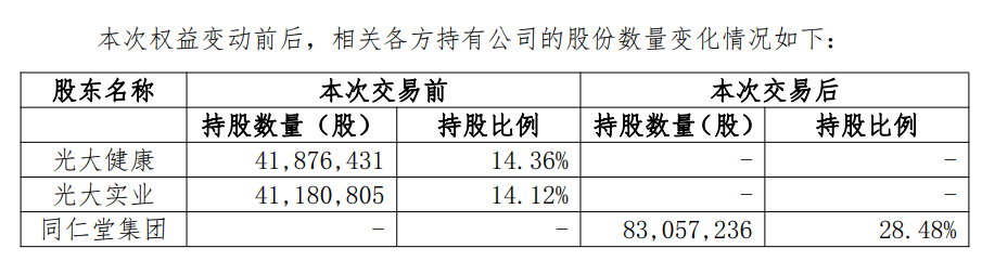 根据公告,转让方光大健康与光大实业均为中国光大集团股份公司旗下企业;受让方同仁堂集团由北京国有资本运营管理有限公司100%持股。