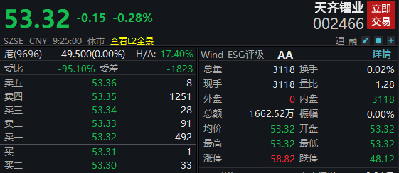A股方面,天齐锂业开盘微跌0.28%,报53.32元/股,总市值约875亿元。