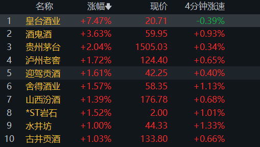 【大河财立方消息】2月4日,白酒股集体冲高,皇台酒业大涨超7%,贵州茅台涨超2%,股价重回1500元上方,酒鬼酒、泸州老窖、舍得酒业、山西汾酒等跟涨。