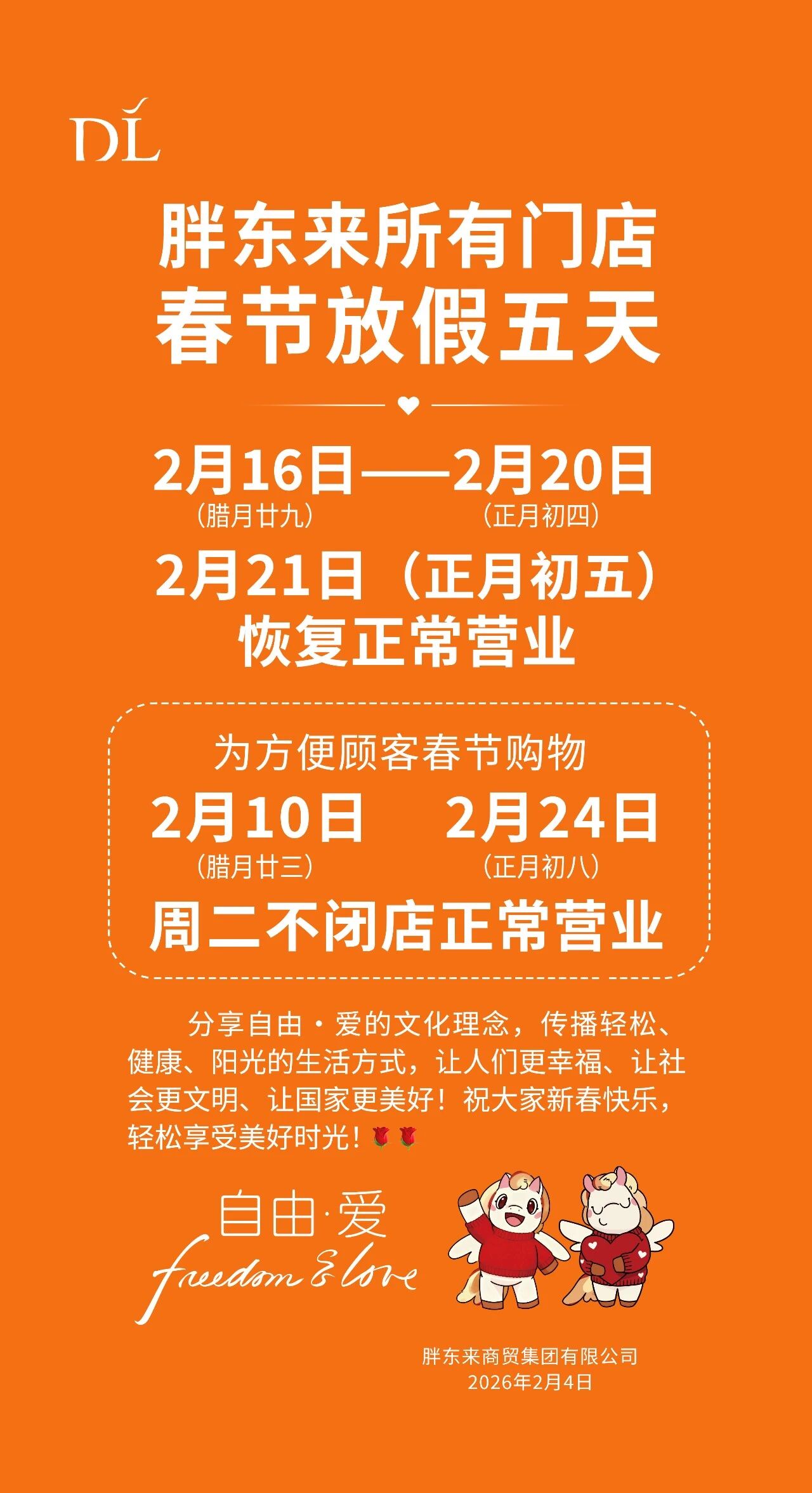 【大河财立方消息】2月4日,胖东来发布春假放假通知:所有门店从2月16日到2月20日放假,一共五天,2月21日(正月初五)恢复营业。