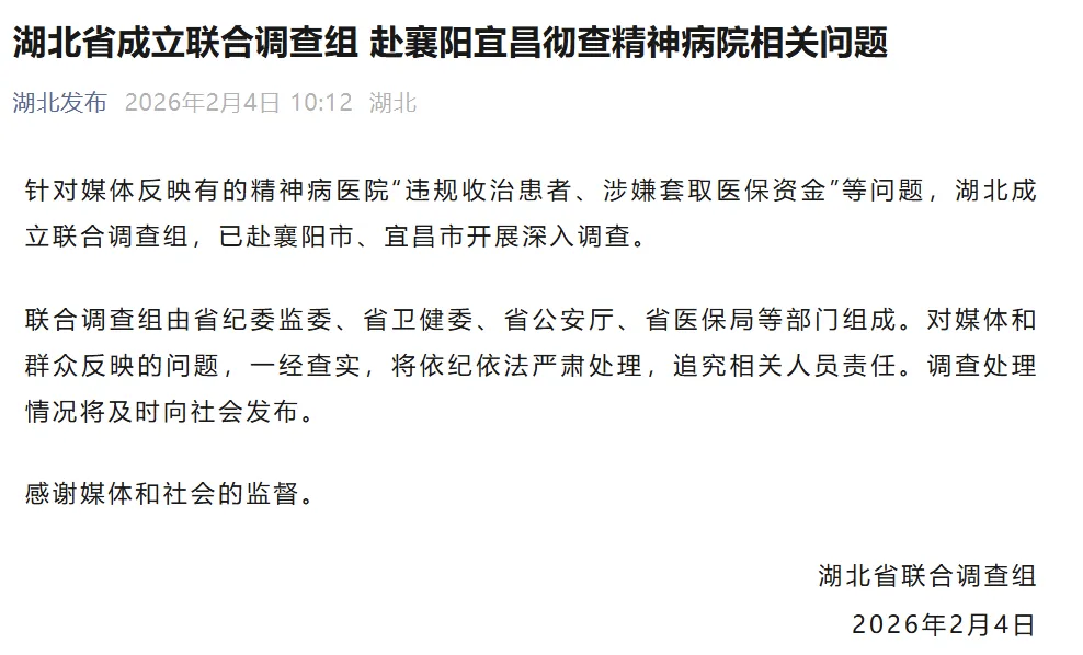 针对媒体反映有的精神病医院“违规收治患者、涉嫌套取医保资金”等问题,湖北省成立联合调查组,已赴襄阳市、宜昌市就此开展深入调查,表示一经查实,将依纪依法严肃处理,追究相关人员责任。