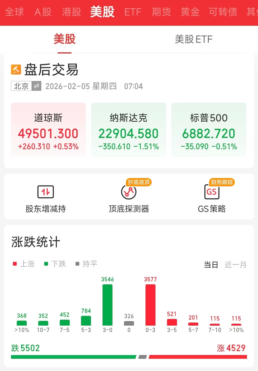 【大河财立方消息】当地时间2月4日,美股三大指数涨跌不一,科技股大跌,纳指连续连续两天跌超1%。截至收盘,标普500指数跌0.51%,报6882.72点;纳斯达克综合指数跌1.51%,报22904.58点;道琼斯指数涨0.53%,报49501.3点。