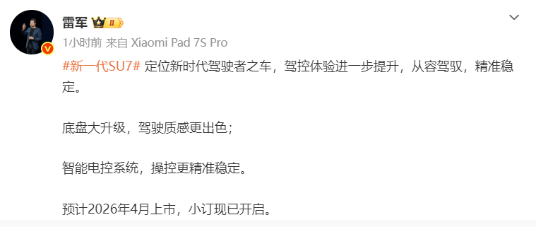 【大河财立方消息】2月5日,雷军在微博发文称,新一代小米SU7预计2026年4月上市,小订现已开启。