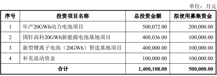 根据预案,国轩高科本次发行股票的发行对象不超过35名,本次向特定对象发行股票募集资金总额不超过50亿元。募集资金在扣除发行费用后拟全部用于年产20GWh动力电池项目、国轩高科20GWh新能源电池基地项目、新型锂离子电池(20GWh)智造基地项目及补充流动资金。