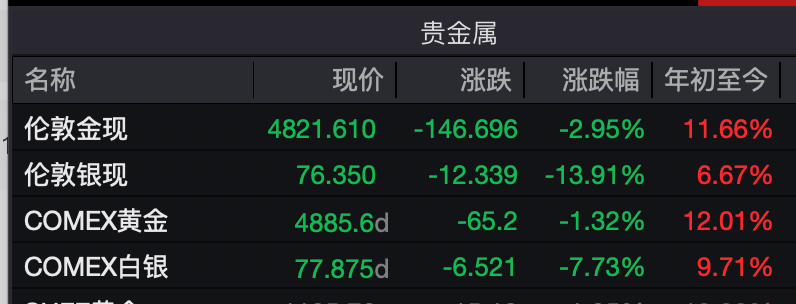 除此之外,黄金、白银均大幅回调。截至发稿,国际现货黄金报4821.61美元/盎司,跌幅接近3%。现货白银暴跌近14%,最新报76.350美元/盎司。