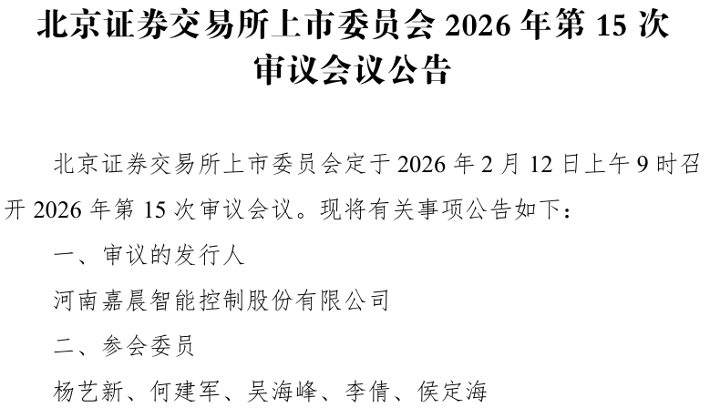 【大河财立方消息】2月5日,北交所上市委发布公告称,定于2月12日上午9时召开2026年第15次审议会议,审议河南嘉晨智能控制股份有限公司(简称“嘉晨智能”)上市事项。