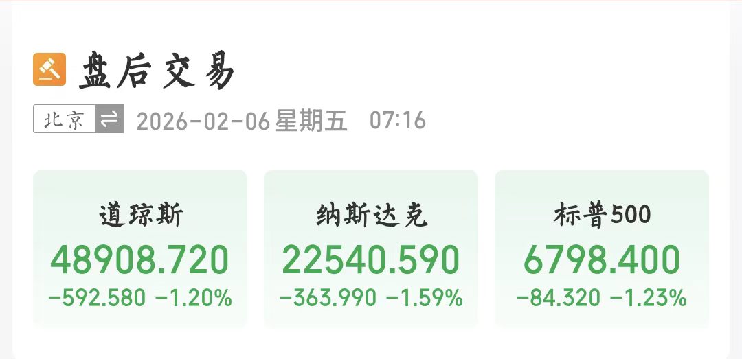 美东时间2月5日,美国三大股指全线收跌,道指跌1.2%报48908.72点,标普500指数跌1.23%报6798.4点,纳指跌1.59%报22540.59点。