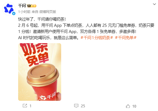 2月6日,千问正式上线“春节30亿免单”,用户使用千问App下单点奶茶,可得25元无门槛免单券,奶茶只要1分钱。此外,邀请新用户使用千问App,双方各得1张免单券。
