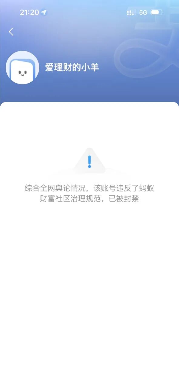 此外,“爱理财的小羊”的蚂蚁财富号已经被封。