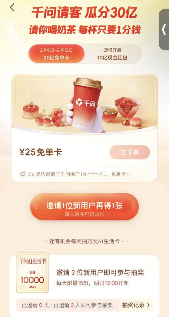 【大河财立方 记者 陈薇】2月6日,阿里千问App开启“春节30亿大免单”,用户可以通过与AI对话,获得25元的免单卡。据千问当天披露数据,活动上线不到3小时,用千问App下单超100万单奶茶。