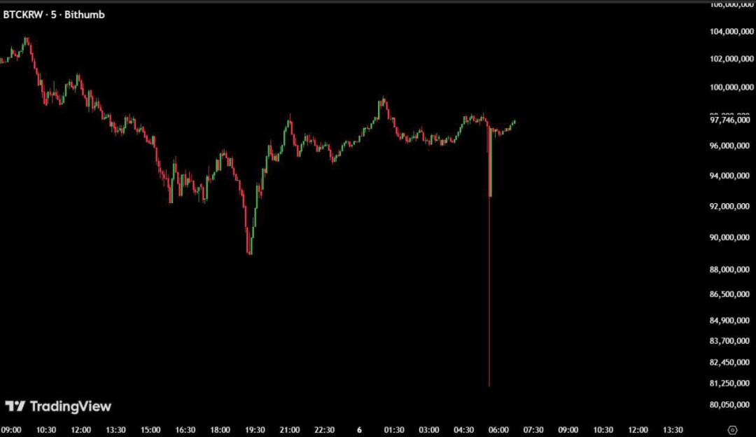 交易所数据显示,周五晚间Bithumb平台上的比特币价格一度从约9829 万韩元(约67188美元)短暂下挫17%,跌至8110万韩元(约55400美元)。交易量随之飙升。