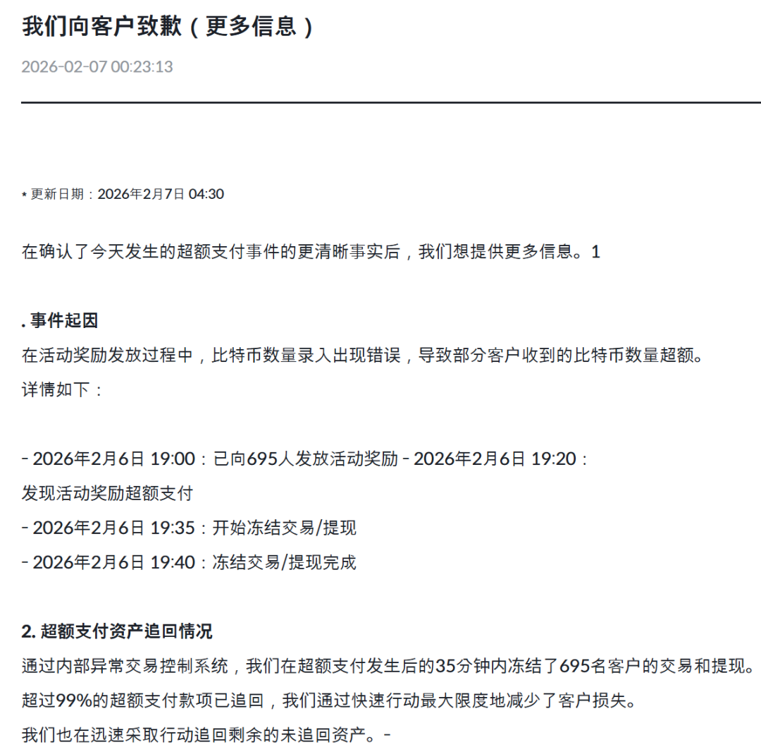 他在周六的声明中称:“我们对由此造成的混乱与不便表示最深切的歉意。我们深感责任重大,承认未能守住虚拟资产交易所的两大核心价值——稳定与诚信。”