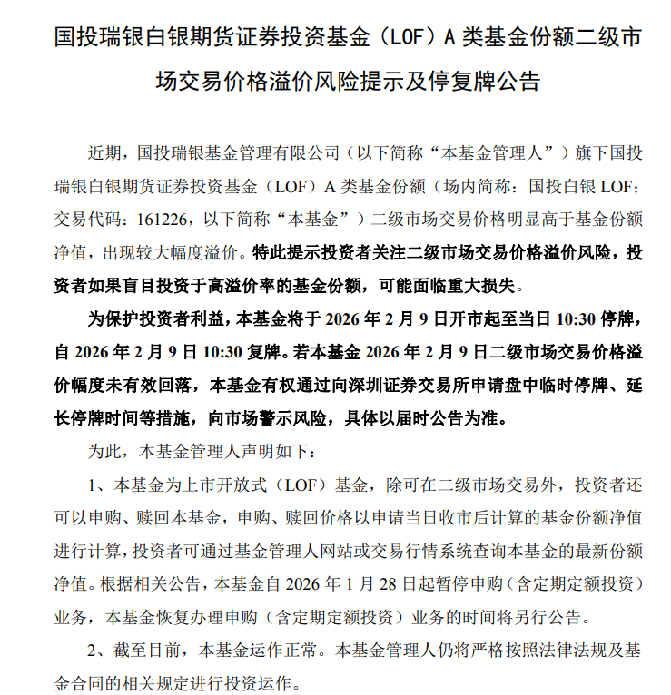 【大河财立方消息】2月8日,国投白银LOF公告称,近期其二级市场交易价格明显高于基金份额净值,溢价幅度较大。为保护投资者利益,基金将于2月9日开市起至10:30停牌,10:30复牌。若当日溢价幅度未有效回落,基金有权采取进一步措施。