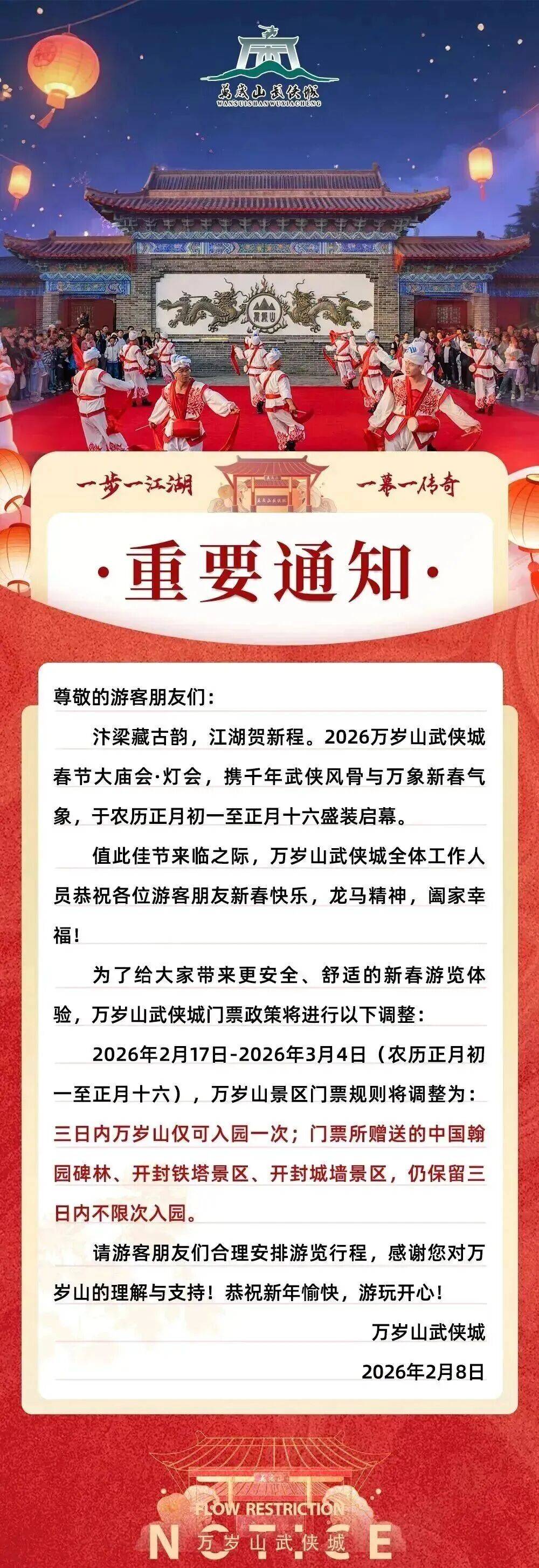 【大河财立方消息】2月8日,开封万岁山武侠城发布关于万岁山春节大庙会期间门票入园政策调整的通知。