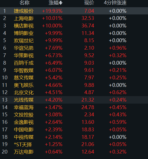 截至2月9日午间收盘,影视院线板块全线上涨,捷成股份20CM涨停,上海电影、横店影视、博纳影业、欢瑞世纪涨停,华谊兄弟、华策影视、光线传媒、幸福蓝海、中国电影等跟涨。