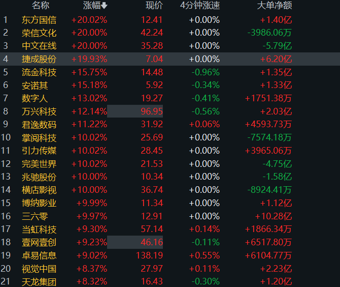 【大河财立方消息】2月9日午后,AI应用端涨势扩大。截至发稿,东方国信、荣信文化、中文在线、捷成股份20CM涨停,掌阅科技、引力传媒、三六零等同步涨停,流金科技、万兴科技、海天瑞声、当虹科技等跟涨。