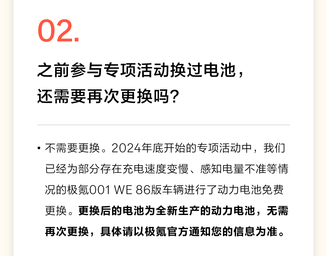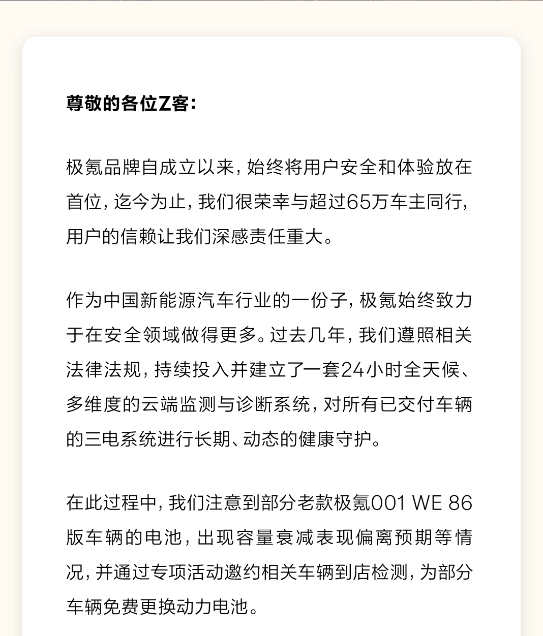 极氪称,注意到部分老款极氪001 WE 86版车辆的电池,出现容量衰减表现偏离预期等情况,并通过专项活动邀约相关车辆到店检测,为部分车辆免费更换动力电池。