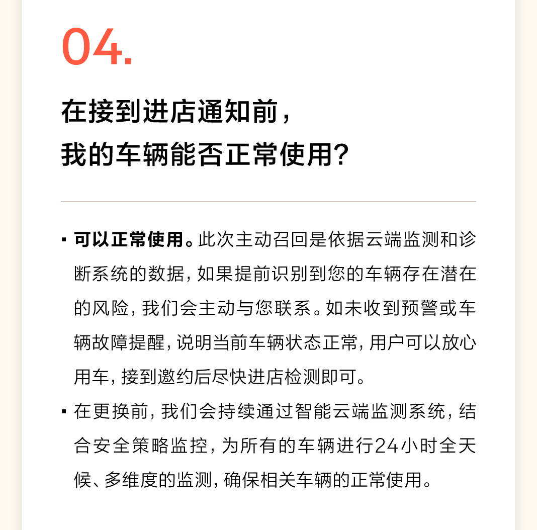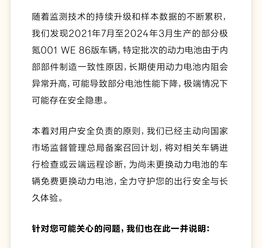 随着监测技术的持续升级和样本数据的不断累积,发现2021年7月至2024年3月生产的部分极氪001 WE 86版车辆,特定批次的动力电池由于内部部件制造一致性原因,长期使用动力电池内阻会异常升高,可能导致部分电池性能下降,极端情况下可能存在安全隐患。