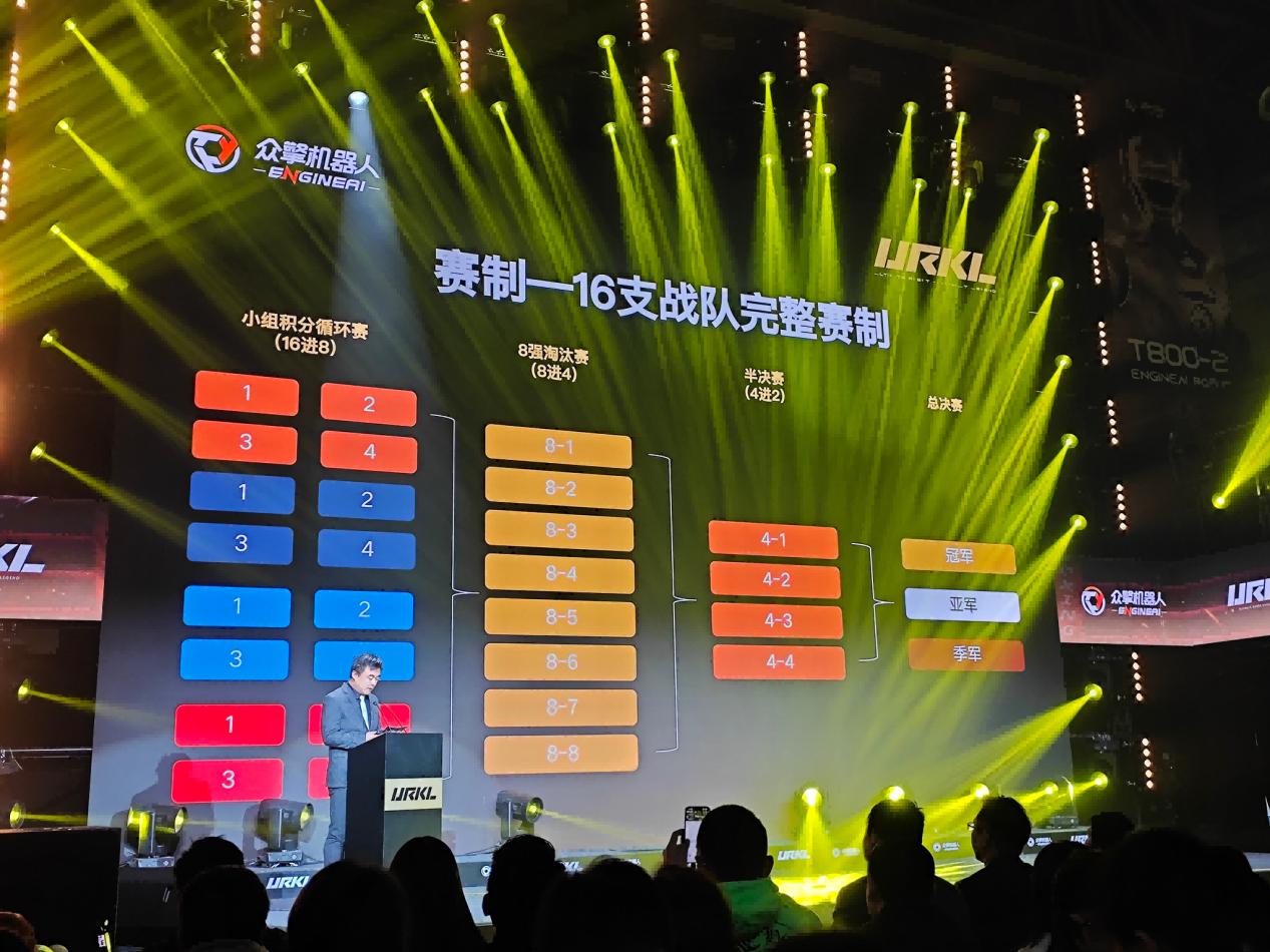 作为首届URKL的协办方,深圳拳明星机器人科技有限公司赛事负责人张锐在会上介绍,经报名和海选审核后,将产生16支URKL的正赛队伍,每支队伍拥有一台主战机器人和一台备用机器人,赛程分为小组积分循环赛(16进8)、8强淘汰赛(8进4)、半决赛(4进2)以及总决赛,比赛将在2026年2月至12月按阶梯式赛程启动。