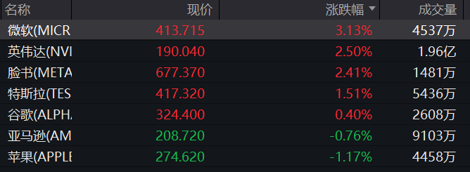 美股大型科技股多数上涨,万得美国科技七巨头指数涨1.02%。微软涨超3%、英伟达涨逾2%、特斯拉涨逾1%、苹果跌超1%。甲骨文大涨超9%。