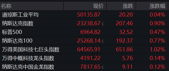 科技股领涨,道指微涨0.04%,报50135.87点,盘中再创历史新高;纳指涨近1%;标普500指数上涨0.5%,逼近历史高点。