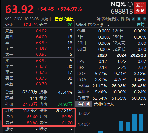 今日新股再现“肉签”,N电科开盘上涨超750%,之后迅速回落,截至发稿上涨574%。电科蓝天成立于1992年10月12日,是中国先进电能源系统解决方案和核心产品的供应商,主要从事电能源产品及系统的研发、生产、销售及服务,主营业务涵盖宇航电源、特种电源、新能源应用及服务三大板块,产品应用覆盖从深海至深空的广泛领域。本次发行价格为9.47元/股,发行市盈率为56.79倍。