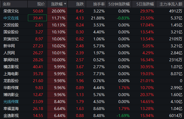 文化传媒板块再现批量涨停,捷成股份、荣信文化20%涨停,中文在线涨超11%,文投控股、国安股份、欢瑞世纪、新华网、人民网、掌阅科技、横店影视、上海电影等涨停。光线传媒、幸福蓝海、金逸影视等涨幅居前。