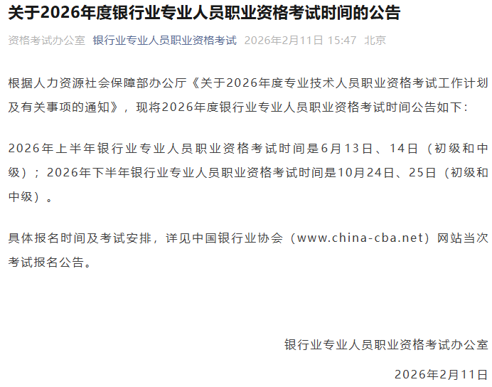 【大河财立方消息】2月11日,银行业专业人员职业资格考试办公室发布公告,公布2026年度银行业专业人员职业资格考试时间。