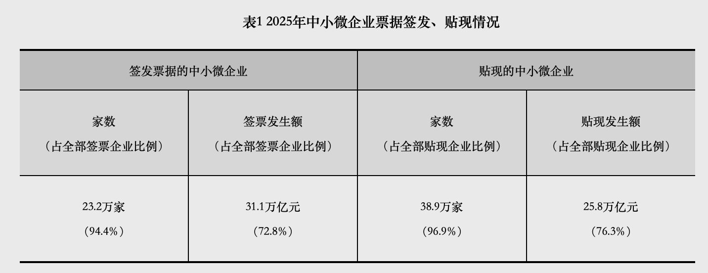 2025年,商业汇票承兑发生额42.7万亿元,贴现发生额33.9万亿元。截至2025年末,商业汇票承兑余额21.2万亿元,较2024年末增加7.2%;贴现余额16.5万亿元,较2024年末增加11.2%。