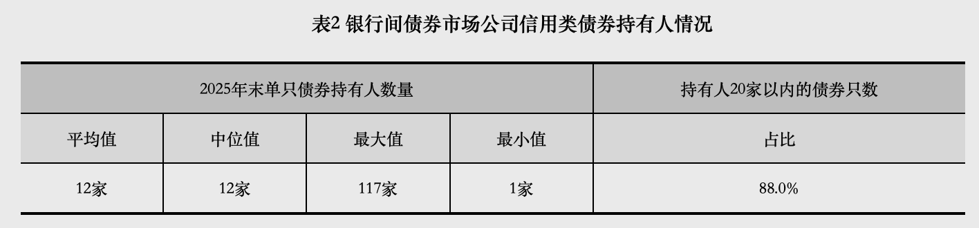 截至2025年末,银行间债券市场的法人机构成员共3923家,全部为金融机构。从持债规模看,公司信用类债券前50名投资者2持债占比53.4%,主要集中在国有大型商业银行(自营)、公募基金(资管)、保险类金融机构(资管)等;前200名投资者持债占比84.5%。