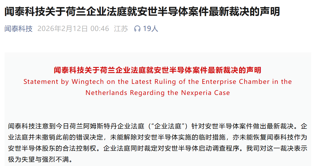 【大河财立方消息】2月12日凌晨,闻泰科技发布声明称,注意到荷兰阿姆斯特丹企业法庭(“企业法庭”)针对安世半导体案件做出最新裁决。企业法庭并未撤销此前的错误决定,未能解除对安世半导体实施的临时措施,亦未能恢复闻泰科技作为安世半导体股东的合法控制权。企业法庭同时裁定对安世半导体启动调查程序。闻泰科技对这一裁决表示极为失望与强烈不满。