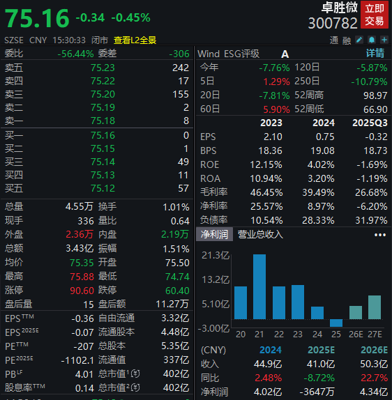 1月12日,卓胜微公告称,预计2025年度归母净利润为亏损2.55亿元~2.95亿元,上年同期盈利4.02亿元。报告期内,公司预计营业收入37亿元~37.5亿元,同比下降约16%~18%。业绩变动主要系向Fab-Lite模式转型过程中,持续投入增加、供应转化影响、行业竞争激烈及原材料交付紧张等因素,对产品出货节奏与规模造成一定影响。