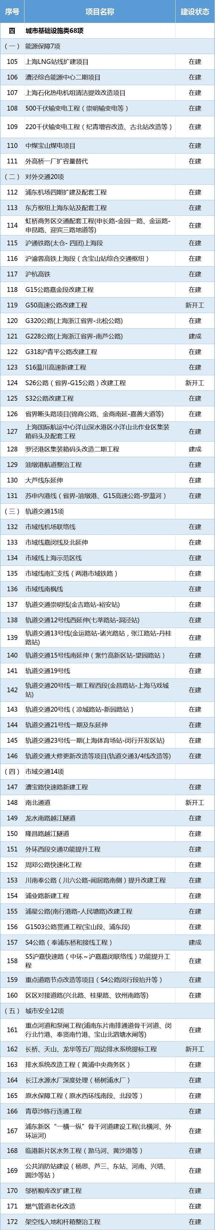 在建项目61项:上海LNG站线扩建、漕泾综合能源中心二期、浦东机场四期扩建及配套工程、东方枢纽上海东站及配套工程、市域线嘉闵线及北延伸、漕宝路快速路、龙水南路越江隧道等。