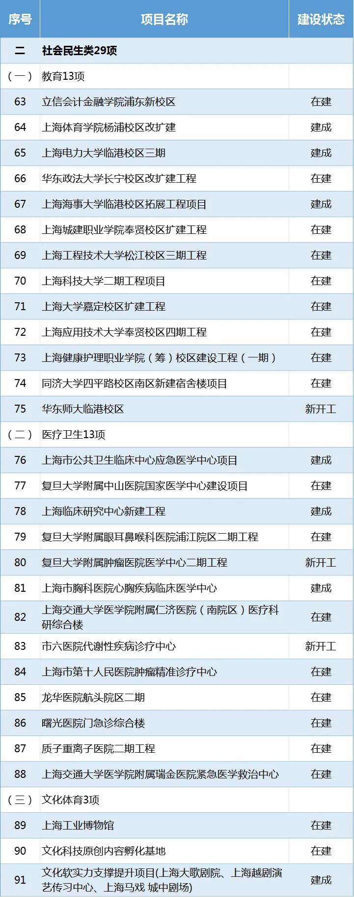 计划建成7项:上海体育学院杨浦校区改扩建、上海电力大学临港校区三期、上海海事大学临港校区拓展工程项目、上海市公共卫生临床中心应急医学中心项目、上海临床研究中心新建工程、上海市胸科医院心胸疾病临床医学中心、文化软实力支撑提升项目等。