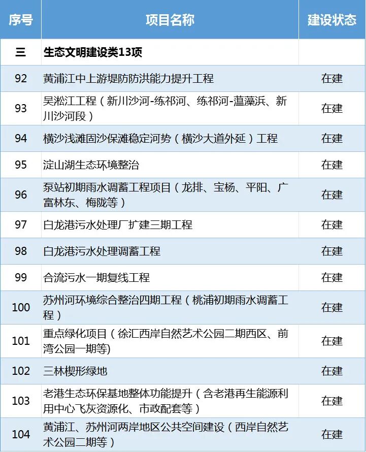 在建项目13项:黄浦江中上游堤防防洪能力提升工程、吴淞江工程(新川沙河-练祁河、练祁河-蕰藻浜、新川沙河段)、淀山湖生态环境整治等。