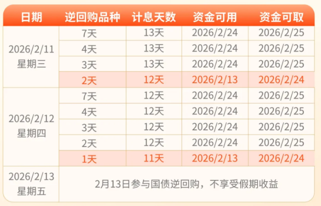 今日,投资者可以借出1天期逆回购(沪市逆回购简称GC001,代码204001;深市逆回购简称R-001,代码131810),就可以收获11天利息,资金在2026年2月24日盘前已可提现。