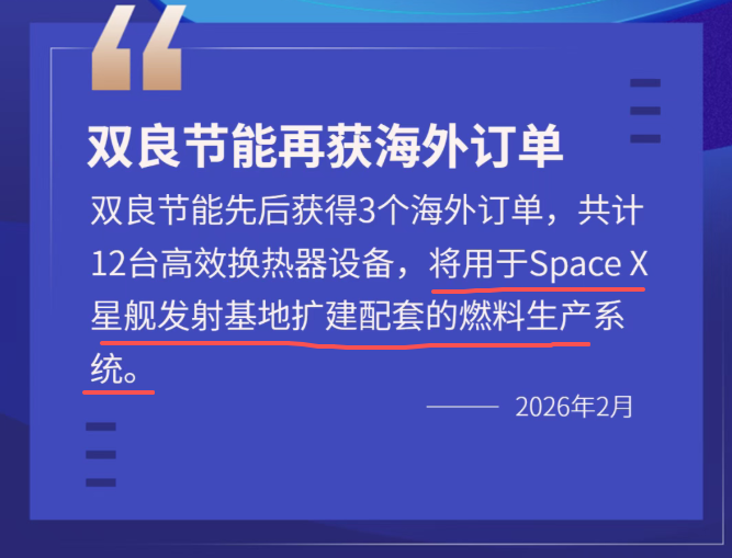 12日午间,双良节能在企业微信公众号发布《双良节能再获海外订单,助力商业航天太空探索》的市场快讯,主要内容为“近日,双良节能先后获得3个海外订单,共计12台高效换热器设备,将用于Space X星舰发射基地扩建配套的燃料生产系统。这是继前期合作后,该产品再度应用于Space X星舰发射基地,充分印证了海外客户对双良节能产品可靠性的高度信任。”