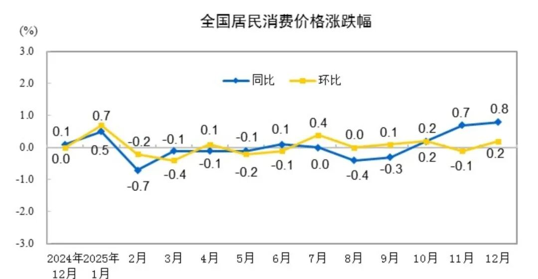 这一套“组合拳”打下来,从2025年底的数据来看,物价已经在温和上涨。比如,反映消费价格的CPI连续4个月回升,12月同比上涨0.8%,是近34个月以来高点;核心CPI同比涨幅已经连续3个月保持在1.2%,是近50个月以来的高位。