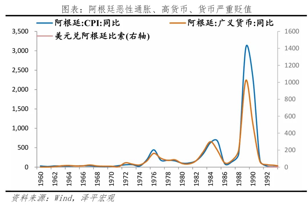 比如,巴西M2年均增速达308%,阿根廷达160%,同期CPI增速分别高达268%、1982%。居民和企业拒绝持有本币,货币一旦到手即被抛弃换取实物。