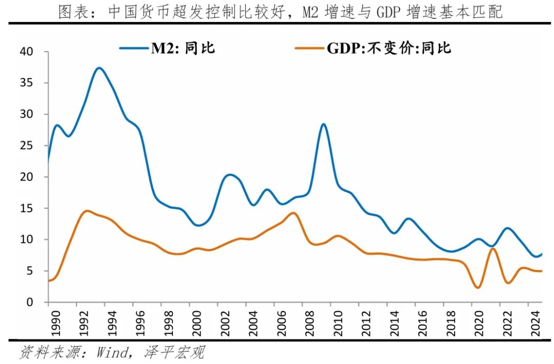 全球货币超发是普遍现象。从1980年到2024年,全球广义货币M2占GDP的比重上升了78个点到141%,大多数经济体M2年均增速高于名义GDP增速。