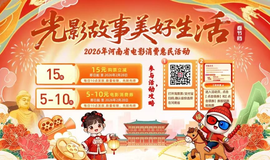 《方案》还提到,要用好河南观影消费惠民补贴。据悉,该活动由河南省委宣传部(省电影局)联合淘票票平台推出,即日起至2026年2月28日每日10点发放,包括15元购票立减券、5—10元电影消费券等。