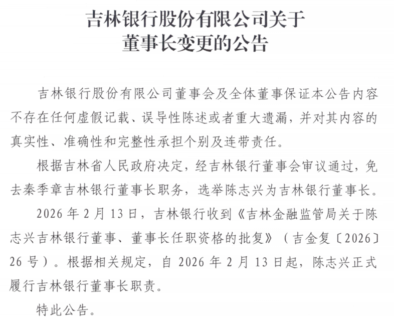 陈志兴的任职资格也获得了监管的批复。根据公告,2月13日,吉林银行收到《吉林金融监管局关于陈志兴吉林银行董事、董事长任职资格的批复》。根据相关规定,自2026年2月13日起,陈志兴正式履行吉林银行董事长职责。