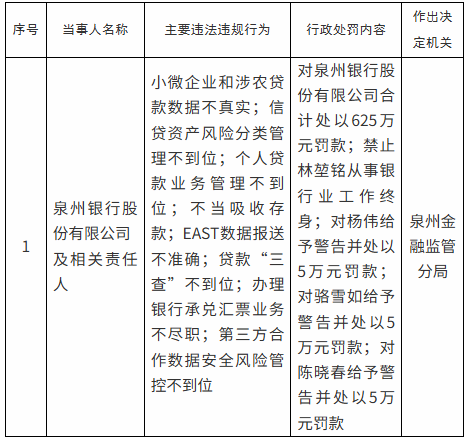 根据相关规定,泉州金融监管分局对泉州银行合计处以625万元罚款,禁止林堃铭从事银行业工作终身,对杨伟给予警告并处以5万元罚款,对骆雪如给予警告并处以5万元罚款,对陈晓春给予警告并处以5万元罚款。