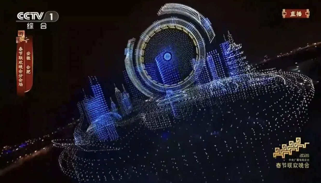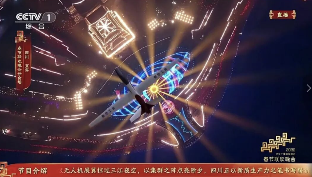 在春晚宜宾分会场,10架“云影”无人机在成飞“文鳐”智慧管控系统操作下,垂直升空后改平飞,之后又调整为楔形编队绕场飞行;2架“翼龙”无人机从自贡起飞。