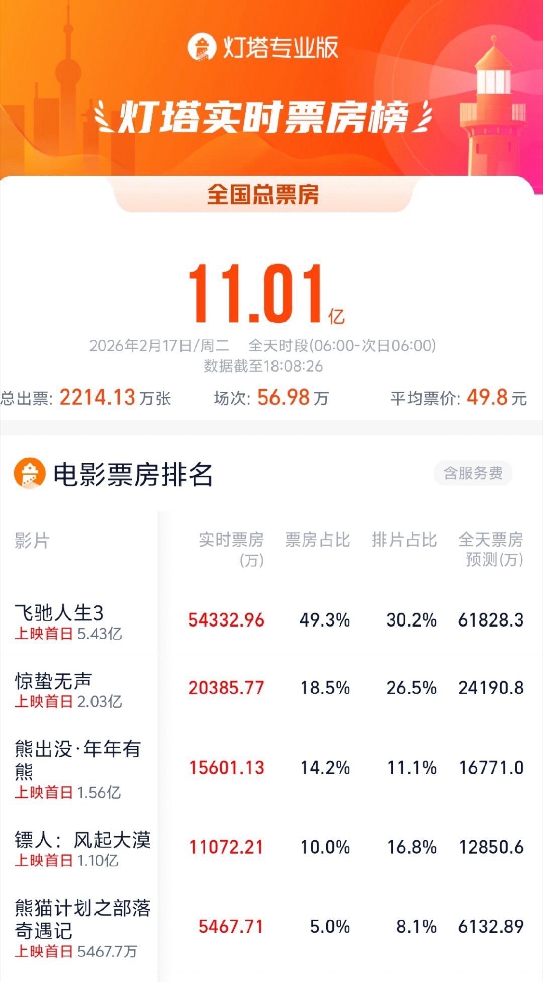 【大河财立方 记者 徐姣】灯塔专业版数据显示,截至2月17日18时8分,2026年大年初一单日票房突破11亿元,春节档(2月15日~2月23日)总票房(含预售)接近13亿元。
