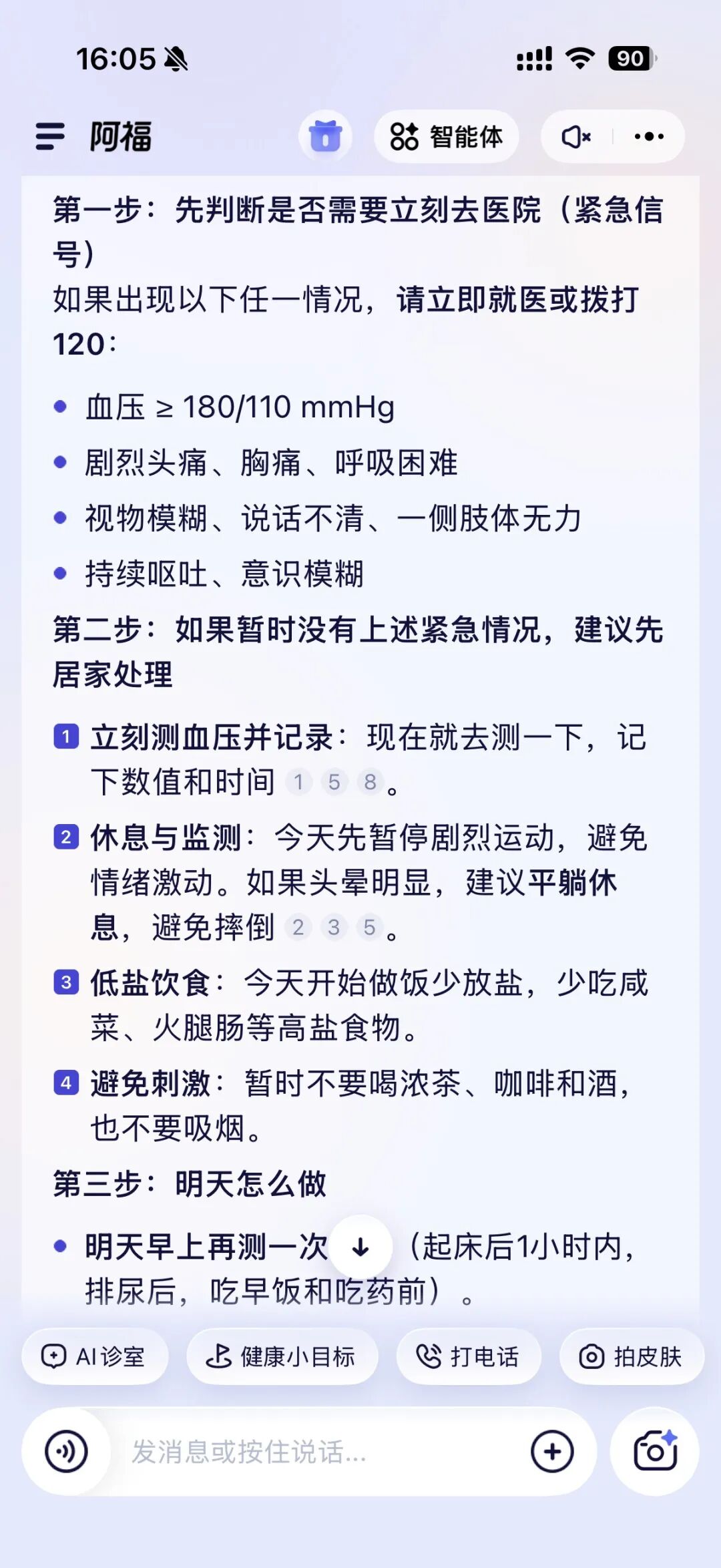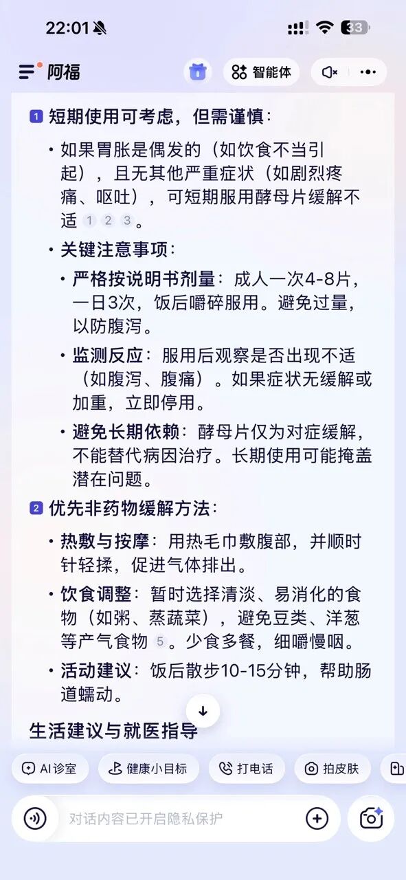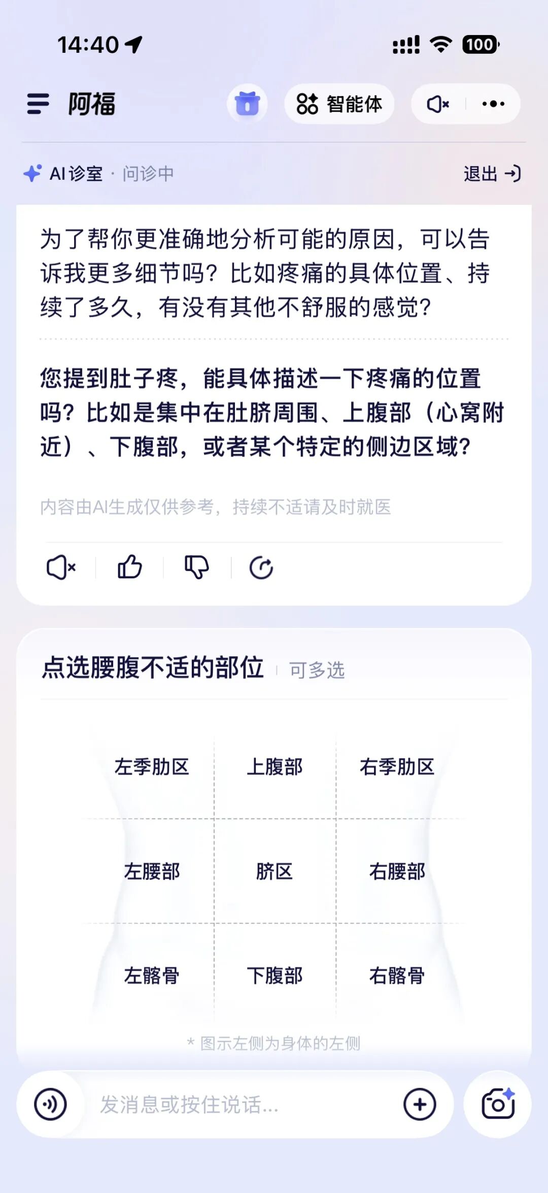 阿福的处理方式不太一样。用户描述症状后,它会反问细节:具体哪个位置疼?持续多久了?有没有其他不舒服?像医生面诊一样,等这些信息收集齐了,再给出判断和建议。