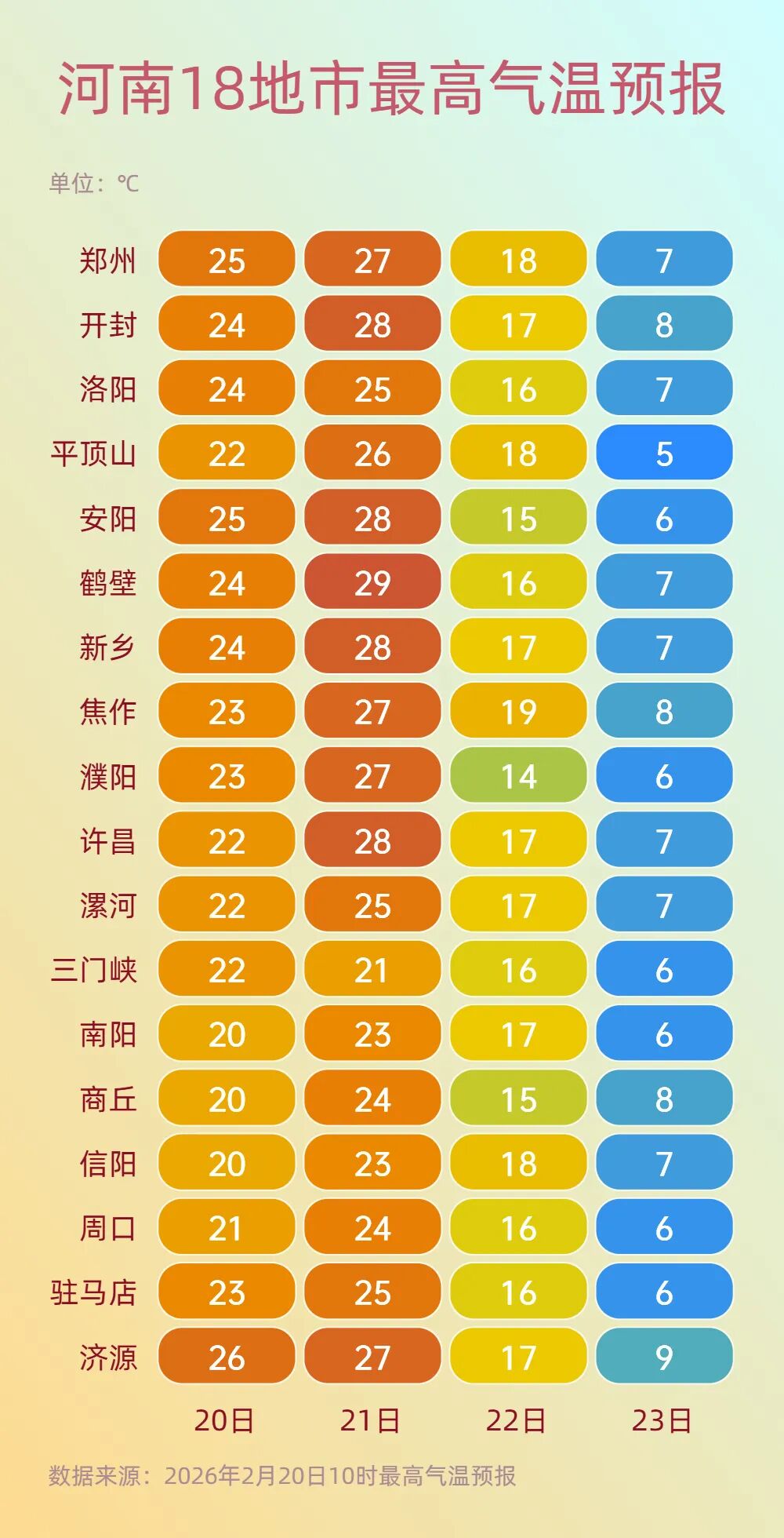 未来三天天气预报(来源:河南省气象台2026年2月20日12时预报)