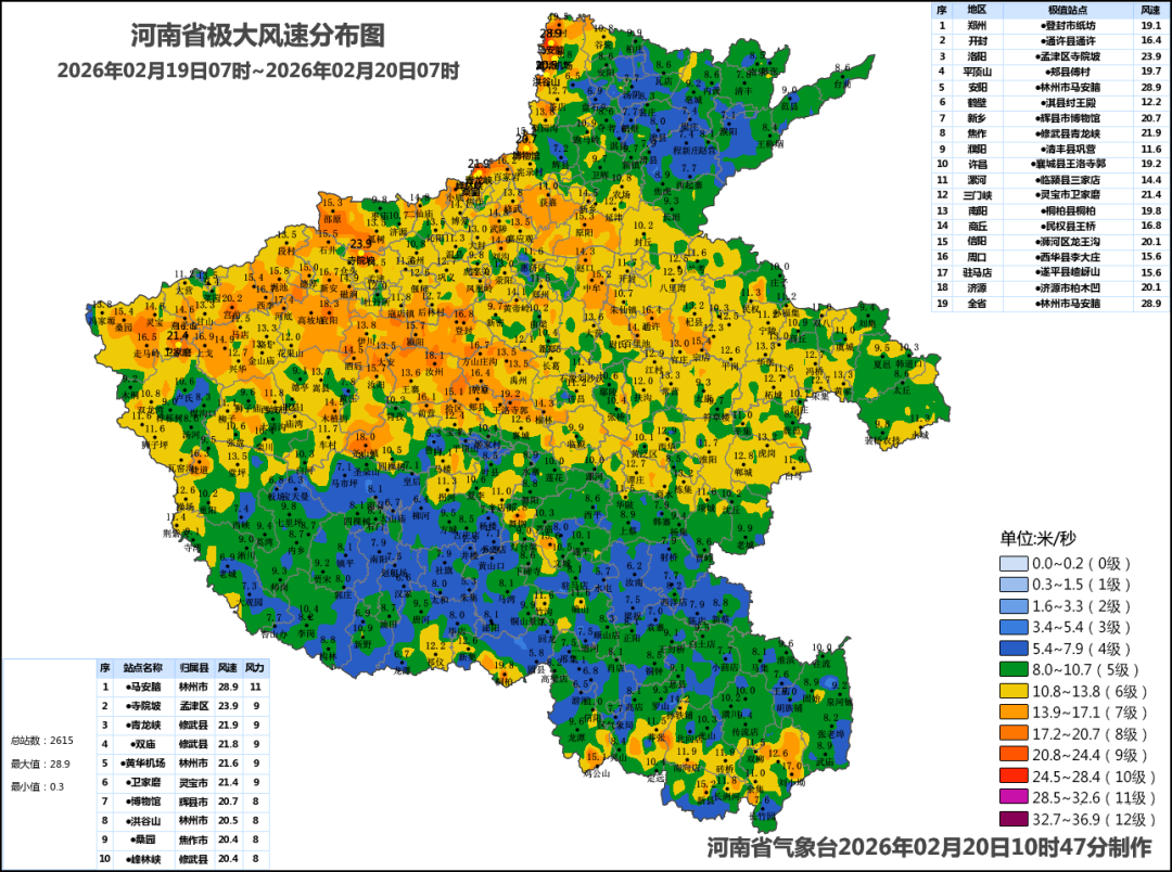 2月19日7时至20日7时,河南省西北部、中西部、 东部部分地区出现6到7级大风,局地8到11级。