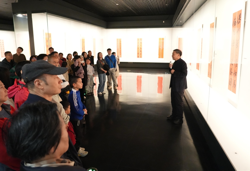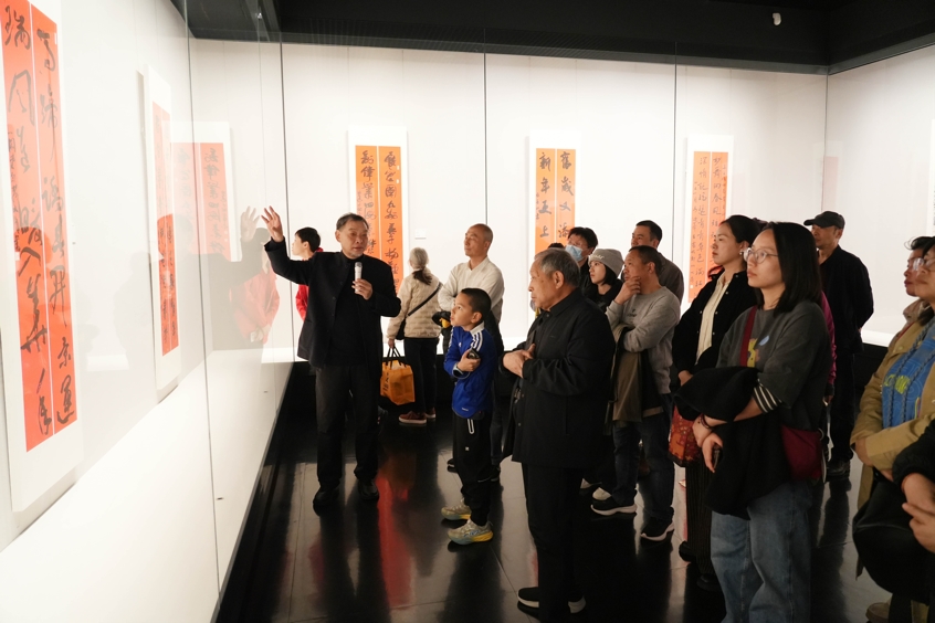 该书法展由河南省书法家协会、郑州美术馆、郑州市书法家协会联合主办,展出作品均是从众多投稿作品中遴选而出的佳作,形式多样,内容丰富。作为导赏专家,罗鸣以深入浅出的语言解析楹联文辞的吉祥寓意与书法笔墨的气韵节奏,带领观众细品书法的独特美学。